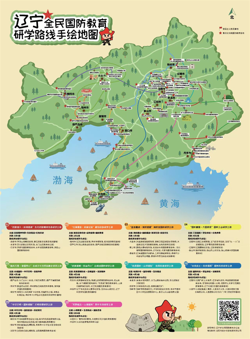 为深入贯彻落实《中华人民共和国国防教育法》,进一步整合全省国防教育资源,规范引导国防研学活动,传承红色基因,赓续红色血脉,省全民国防教育办公室委托专业机构,规划设计了“抗联烽火·林海铸魂”“抗美援朝·铁血丹心”等10条国防教育研学路线,制作了手绘地图,供全省国防教育研学参考选用。